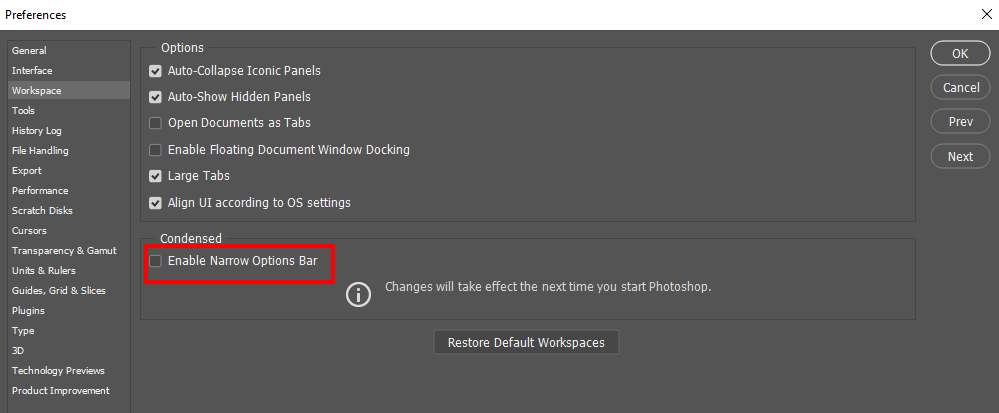 it shows part of a different tool’s option, Check the Both machine Photoshop Preferences Workspace Preference for your Tool opinion bar are set the same.
