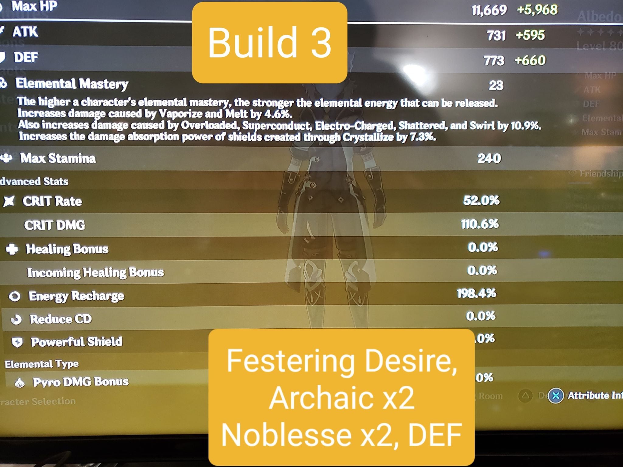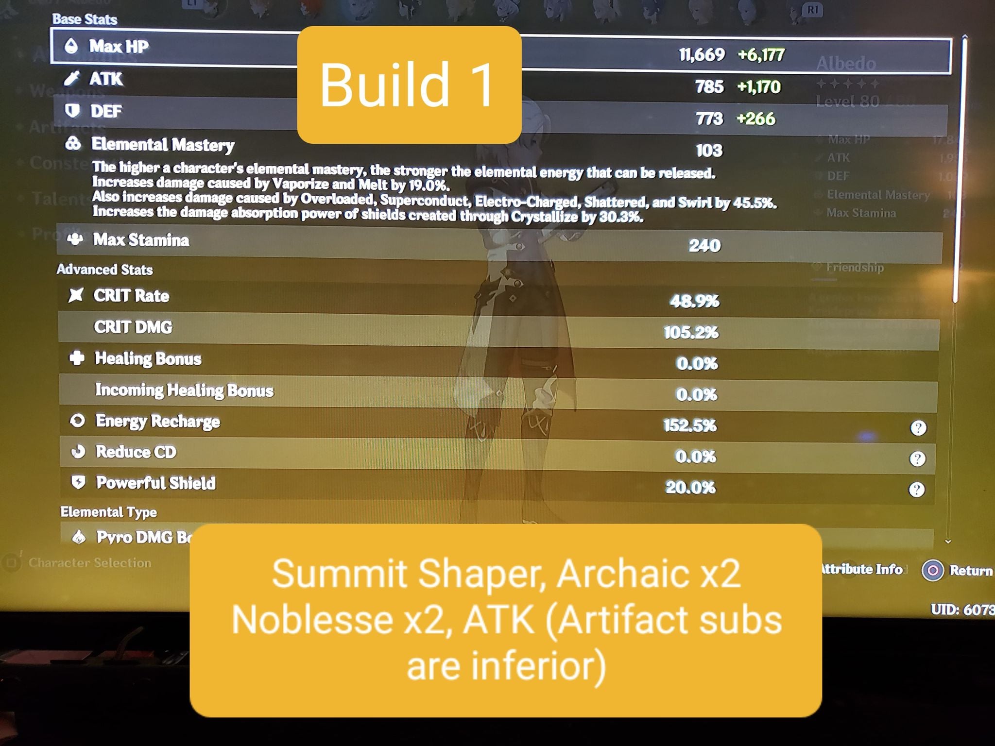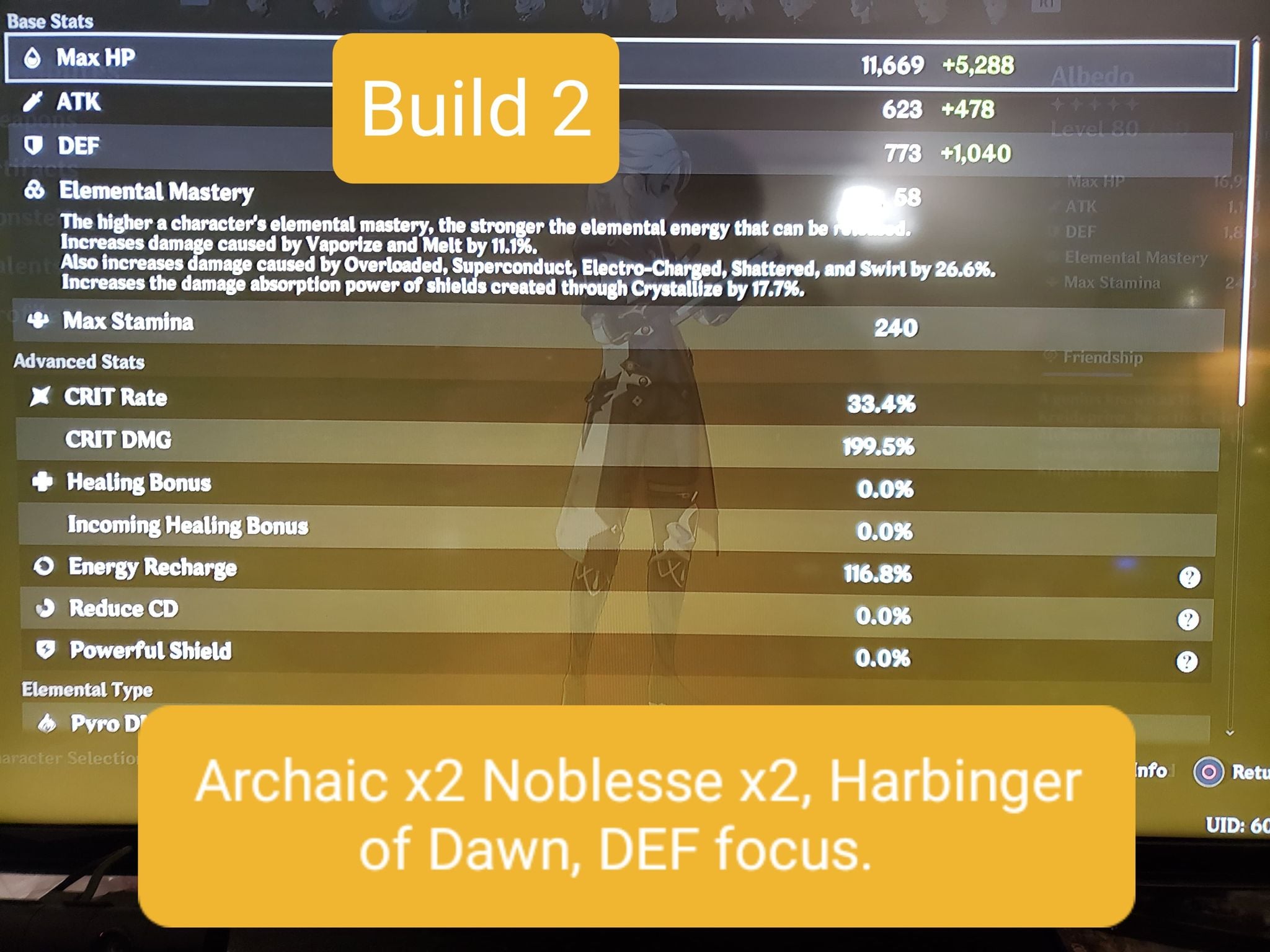 Also, Archaic Petra x4 is valid if you’re willing to adjust your playstyle to purposely create the right element of Crystallize and make sure to pick it up with Albedo himself. I found this clunky and annoying to do, settling ultimately for Noblesse x2 instead. EDIT: In particular, C0 Harbinger builds should consider Archaic x4 since their Burst damage is already so hindered.