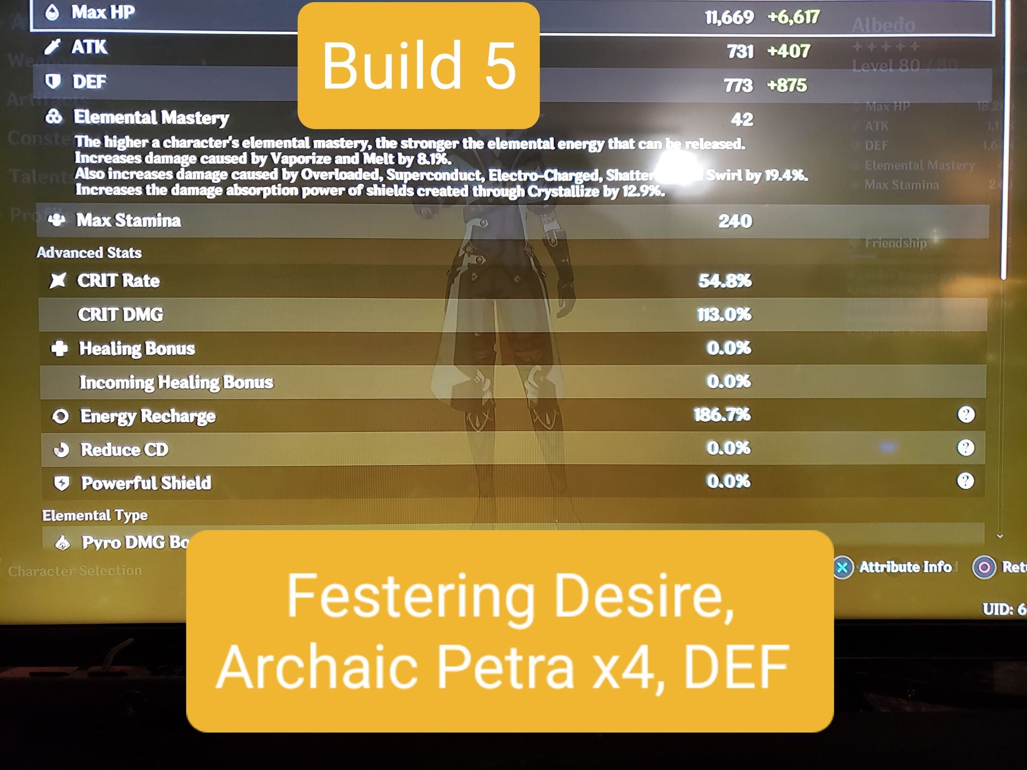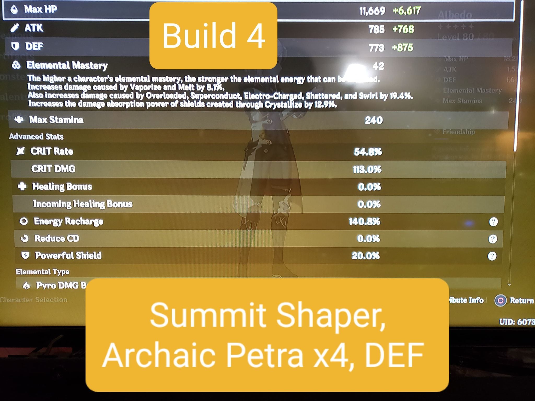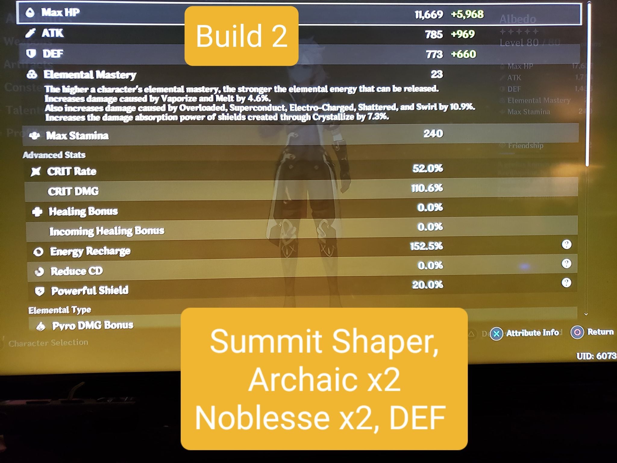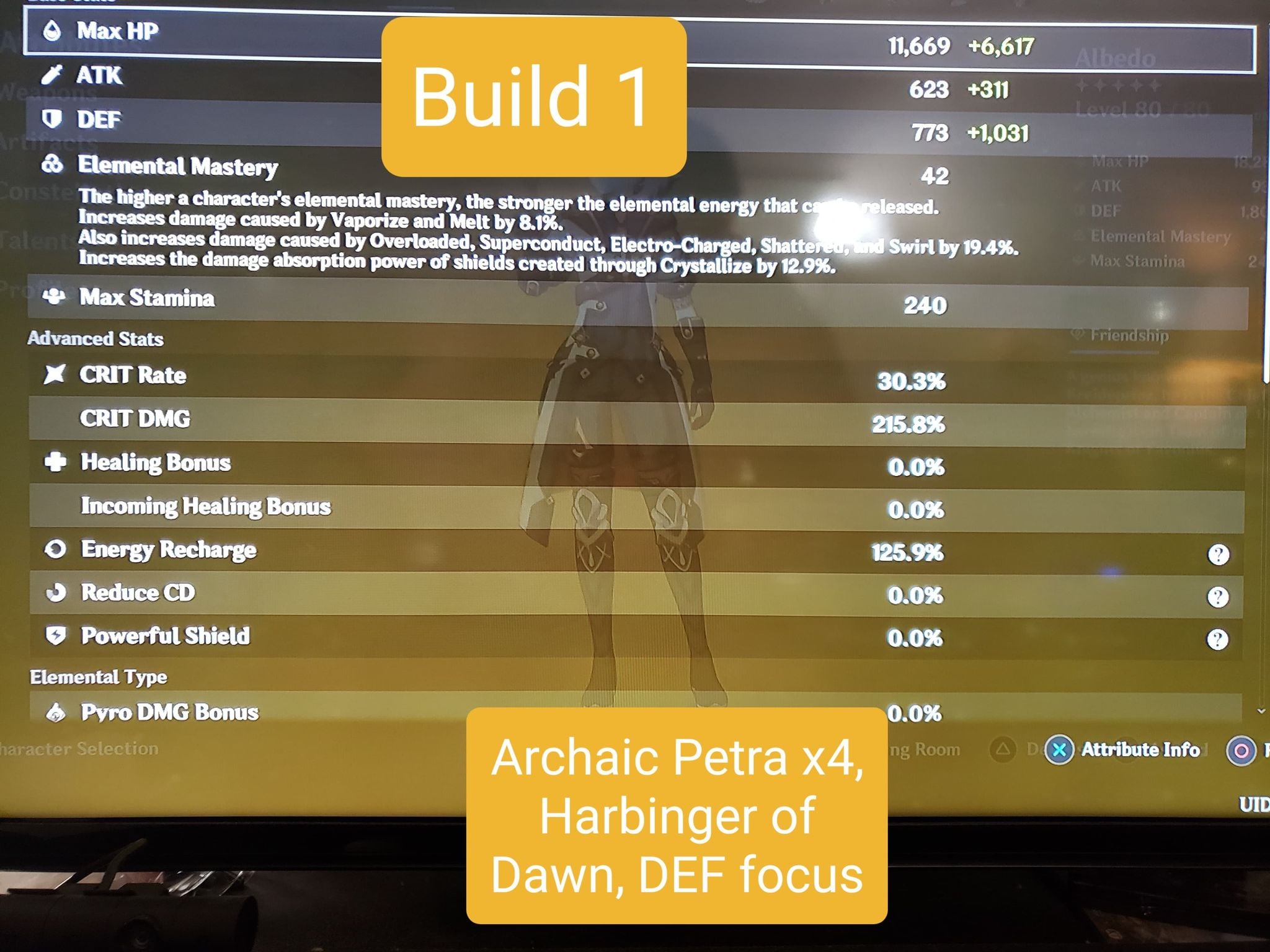 Also, Archaic Petra x4 is valid if you’re willing to adjust your playstyle to purposely create the right element of Crystallize and make sure to pick it up with Albedo himself. I found this clunky and annoying to do, settling ultimately for Noblesse x2 instead. EDIT: In particular, C0 Harbinger builds should consider Archaic x4 since their Burst damage is already so hindered.