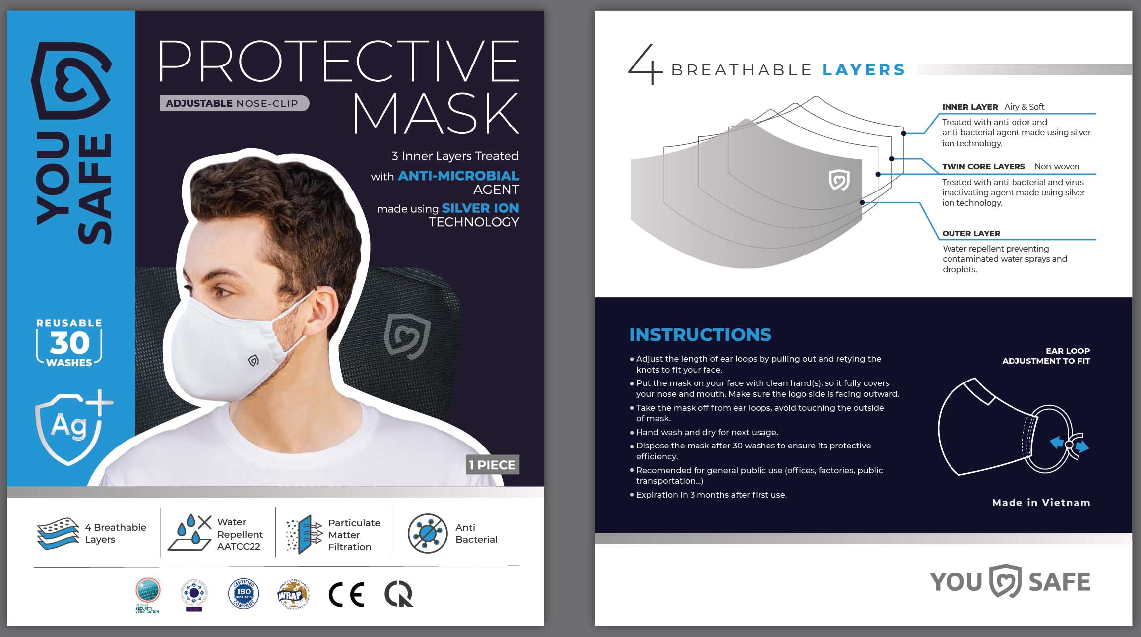 With anti -bacterial and virus inactivating technology, Bee.Activ is able to inactivate some strains of viruses by degrading viral proteins. The active agent made using this technology has been applied in the USA, Canada, EU. Therefore, even if the contaminated organisms leak through the water repellent outer layer, they will be trapped and inactivated at the core layers, thanks to the treatment of the core layers using this active agent.