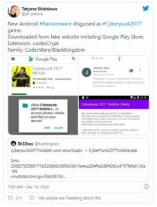 Appears ransomware fake Cyberpunk 2077 on mobile, asking for a ransom of 11.5 million. Although