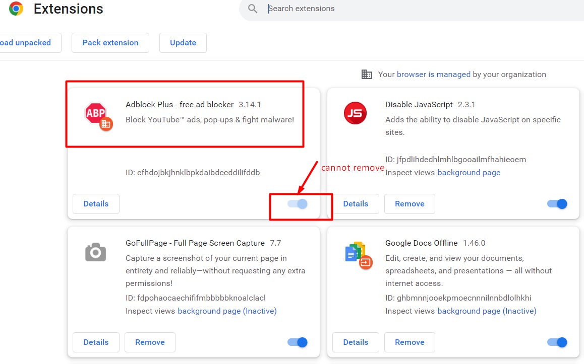 Cannot remove Adblock Plus extension from chrome and firefox .I cannot find the way to remove the Adblock Plus extension for the life of me. It says “Can’t be removed”. I re-started in Safe-Mode, and it still cannot be removed. I did Firefox’s “fresh re-install” thing, which is supposed to remove all extensions, and it’s still there. Should I report the extension?