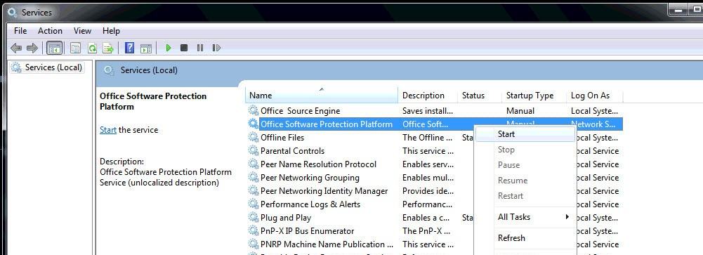 Open Run window, type services, press enter to open the manager of running services or not. Find the service named Office Software Protect Platform, right-click and select Start.