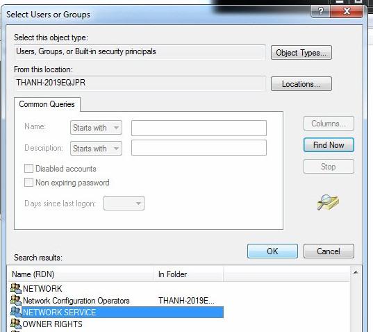 Navigate to the Local User and Groups directory tree -> Groups -> select Add … -> Advanced … -> click the Find now button and scroll down to find the list of NETWORK SERVICE