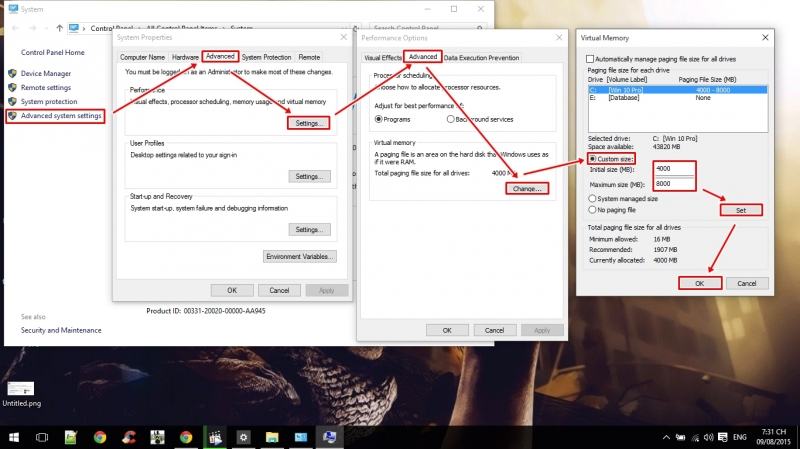 Next, select Advanced system settings, select Settings … and select Advanced, select Change …, then select Custom size.