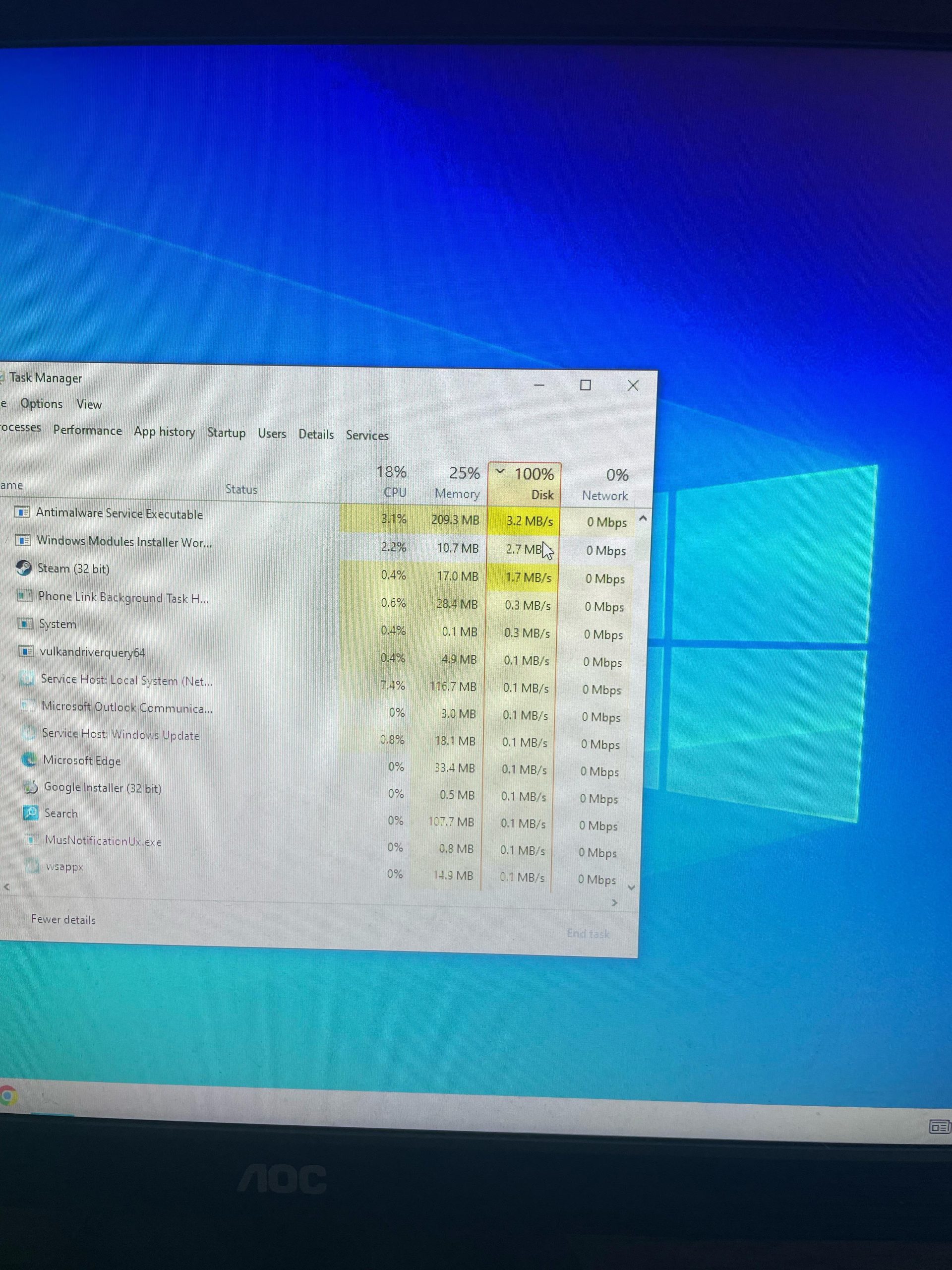 The three biggest culprits are Windows Defender (antivirus, anti malware, anti spyware), Windows Module Installer (most likely windows update but not limited) and Steam platform all running concurrently with a heavy work load. The majority of mechanical HDDs cap out at about 10 MB/s which if you total up those 3 it comes pretty close to the cap and that means your computer won’t be able to do much more until those 3 are either closed (completely and not running in the background) or they complete their task.