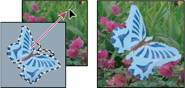 Click inside the window of the image you want to move and drag it into the other window. Press and hold Shift and release your mouse button to drop and center the image inside the document.