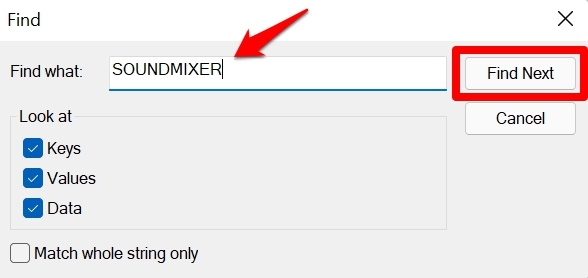 - In case, you find the folder SOUNDMIXER is located after performing the find action, then open that folder in the registry itself.