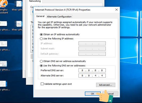 Finally, select Use the following DNS server addresses and enter Google DNS as shown in the following image, then select OK .