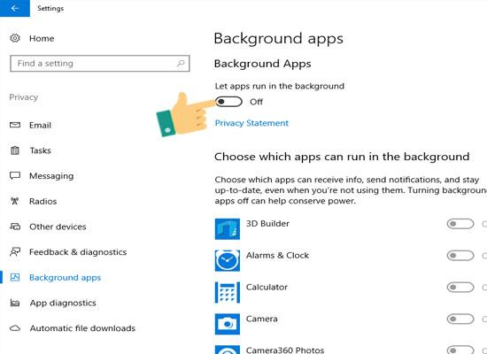Click Backgound apps and then turn them off at Let apps run in the back ground .