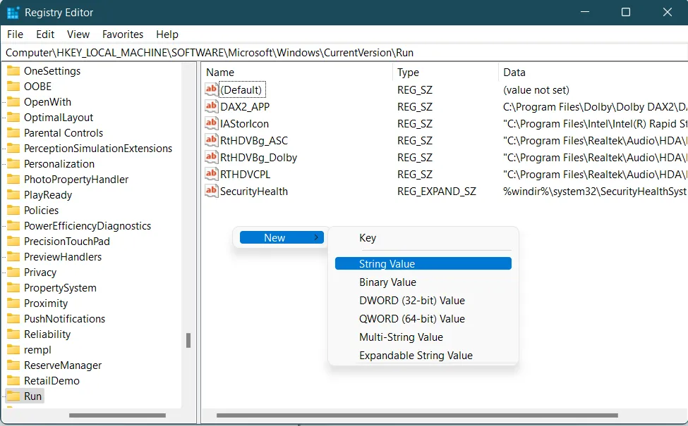 HKEY_LOCAL_MACHINE\ SOFTWARE\ Microsoft\ Windows\ CurrentVersion\ Run - In the empty space on the right, right click and select ‘New’, then ‘ String Value ‘.