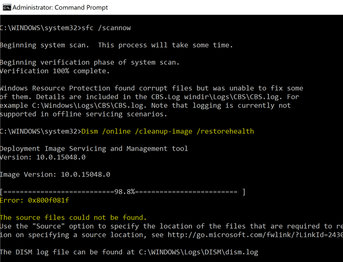 Running the command DISM.exe /Online/Cleanup-image/RestoreHealth to repair parts store may throw error 0x800f081f: