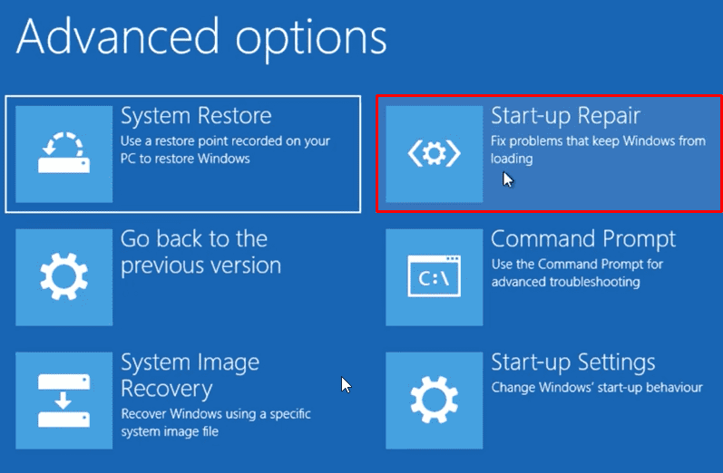Step 2: Then select the Troubleshoot option on the next page. Click the Startup Repair option under Advanced Settings.
