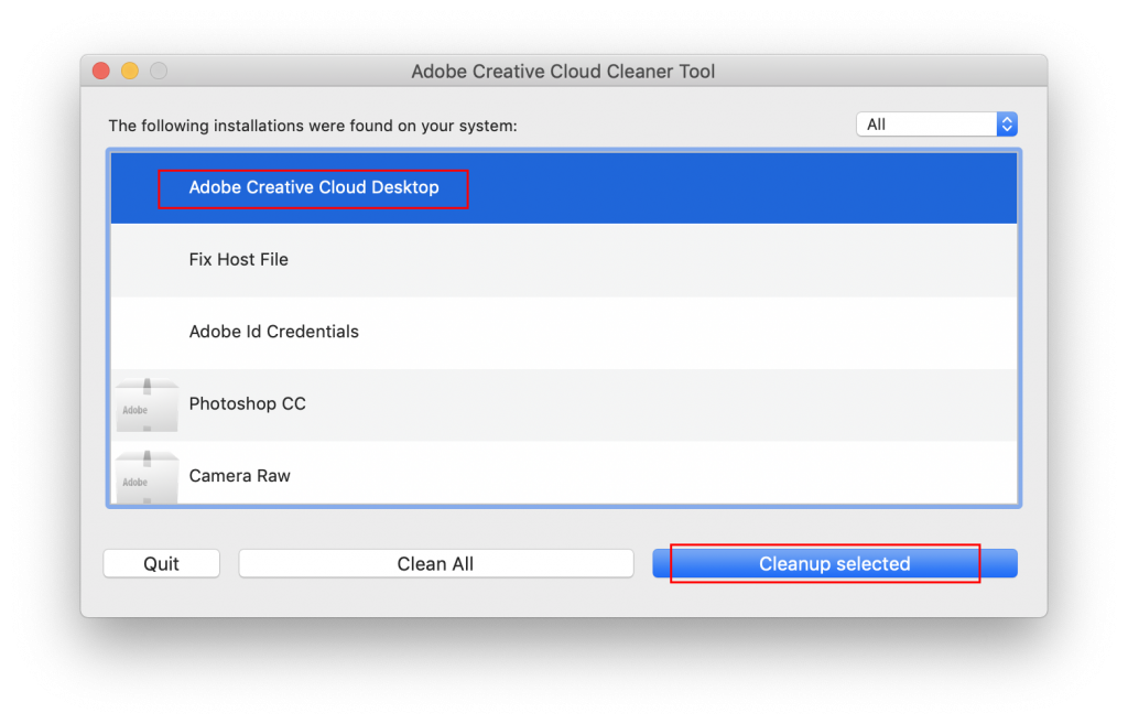 After the download is complete, open the downloaded file > Run the file: Adobe Creative Cloud Cleaner Tool and select as shown