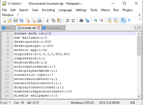 The first four lines show your remote connection screen size options (multi-monitor mode possible). You can edit screen mode to set up a remote window session in screen mode. For example “id:i:2” sets up full screen where “id:i:1” establishes remote connection appears in windowed mode.