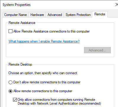 Allow connections only from computers running Remote Desktop with Network Level Authentication (recommended) (Allow connections only from computers running Remote Desktop with Network Level Authentication (recommended).