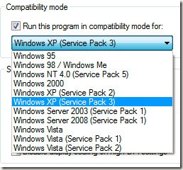 Select the Compatibility tab , tick the Run this program in compatibility mode for :