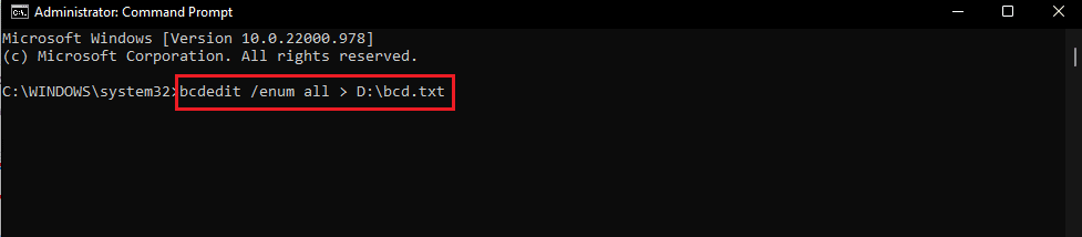 Note: Here, D: The file bcd.text will be saved in partition D. Replace the entry if you want to save the data in a different folder with a different name.