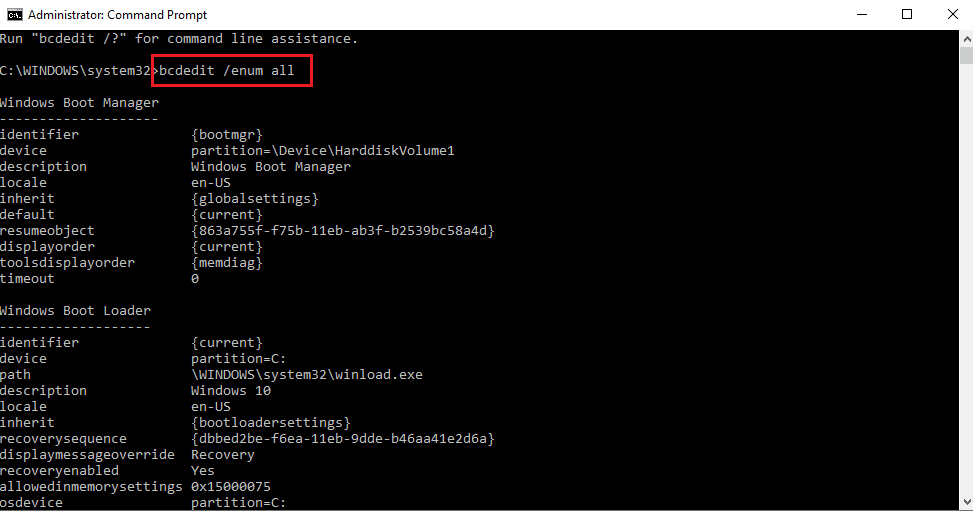 3. Type the command bcdedit /enum all and press Enter key to see the items of the orphaned window setup.