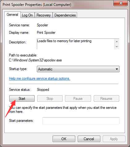 5. Select Stop at Service status and then press Start again immediately afterwards.