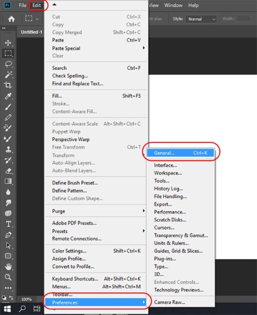 Go to Edit (Windows) / Photoshop (macOS) > Preferences > General.