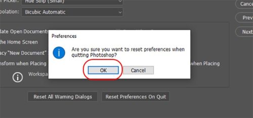 A message will appear asking if you are sure you want to reset preferences when you exit Photoshop. Click OK .