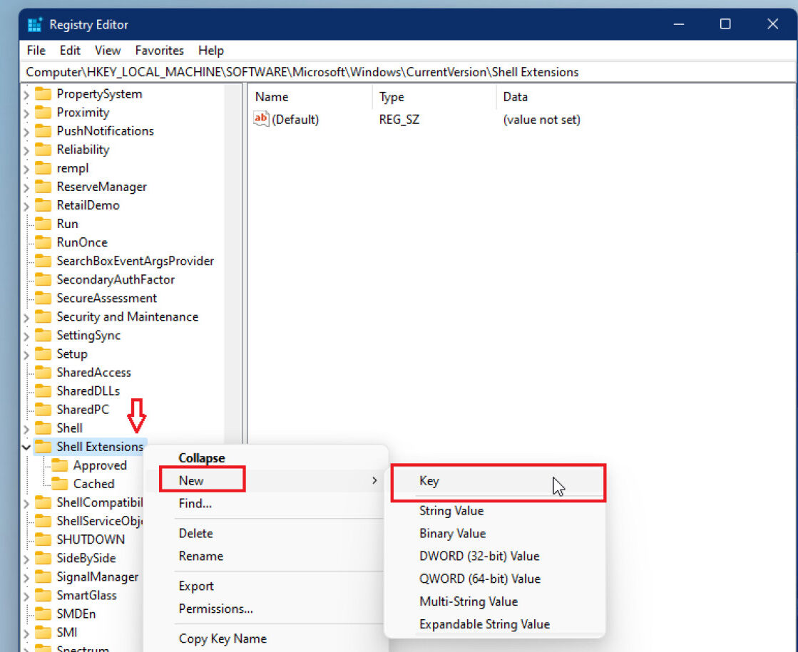 Then, right-click on the Shell Extension folder , select New > Key