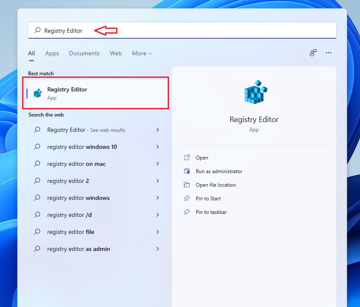 Go to Search, find and select Registry Editor