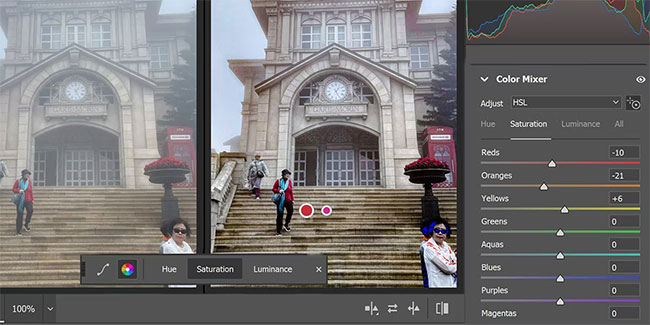 The Color Mixer feature allows you to selectively change colors or increase/decrease their Luminance or Saturation. Since changing Hue will disrupt the colors of your image, you should only adjust the Saturation and Luminance settings.