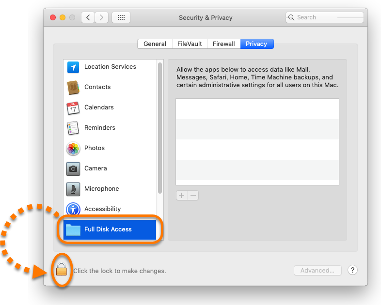 If you are unable to drag and drop VirusBarrier X9 into the window as illustrated above, you can manually add the application to the Full Disk Access list.