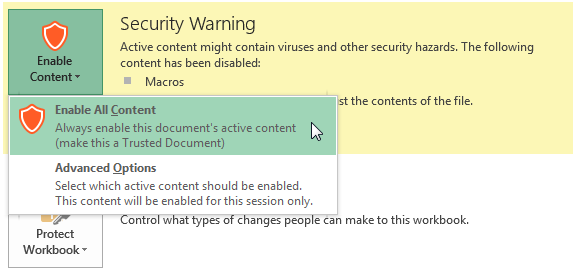 If you open an Excel file with macros, you will see a yellow message bar with a shield icon and an Enable Content button .