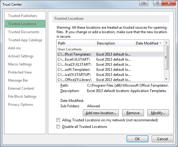 - In Excel go to the File tab -> Options -> Trust Center -> Trust Center Settings -> Trusted Locations.