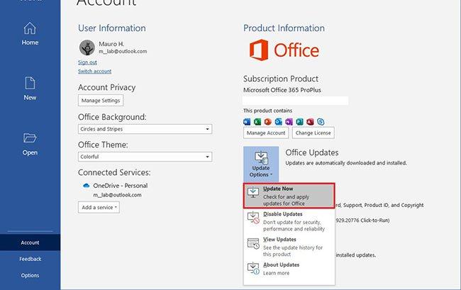 To update Microsoft Office 365, Office 2019, or Office 2016, follow these steps: