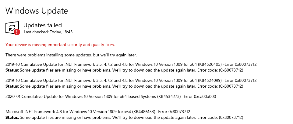 How to fix ERROR_SXS_COMPONENT_STORE_CORRUPT Windows 10 ,.So I want to update my windows 10 to the latest version but whenever I try it tells me it’s getting things ready and when it finishes it then tells me “Some update files are missing or have problems. We’ll try to download the update again later. Error code: (0x80073712)”, I have no idea what to do and I really want help, so I would appreciate any sort of help