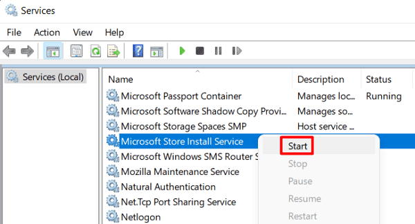 - On the Services window, scroll down and find the Microsoft Store Install service.