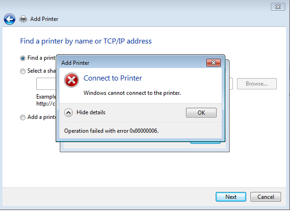 When adding a network printer you may receive an error that says, “Windows cannot connect to the printer. Operation failed with error 0x00000006.”