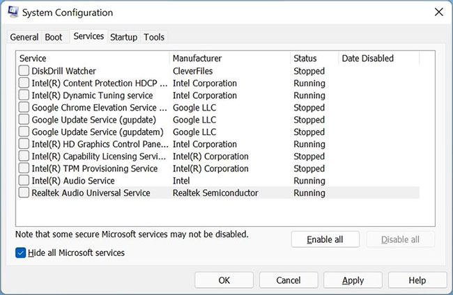 4. Check the Hide all Microsoft Services box.