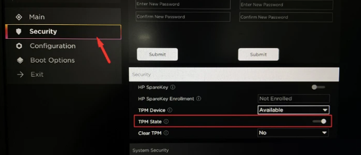 Once in the BIOS setup screen, click Security on the left side of the screen. Enable TPM / Trusted Platform Module option on the right side of the screen. If there is a drop-down menu, select the Enable option.