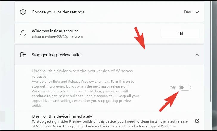 Click the toggle after the option to enable Unenroll this device when the next version of Windows releases.