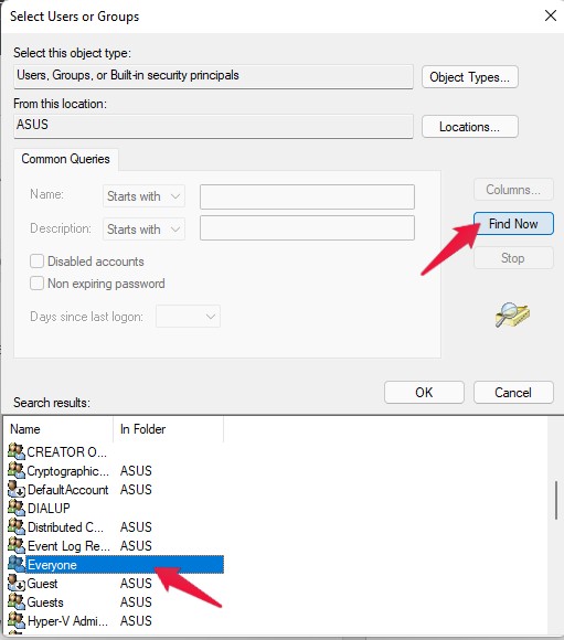 - Click on “Find Now” and select “Everyone”. Then click OK.