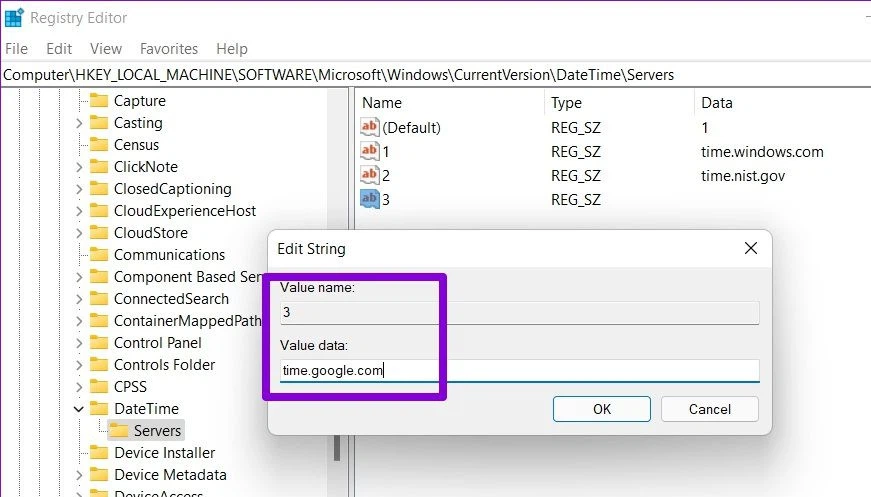 Step 4: In the Edit String dialog box displayed, in the Value data field, enter time.google.com and click OK.