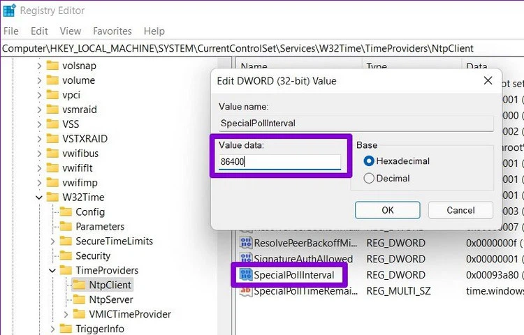 Step 3: Double-click the SpecialPollInterval key and change its value to 86400 . Click OK to save the changes.