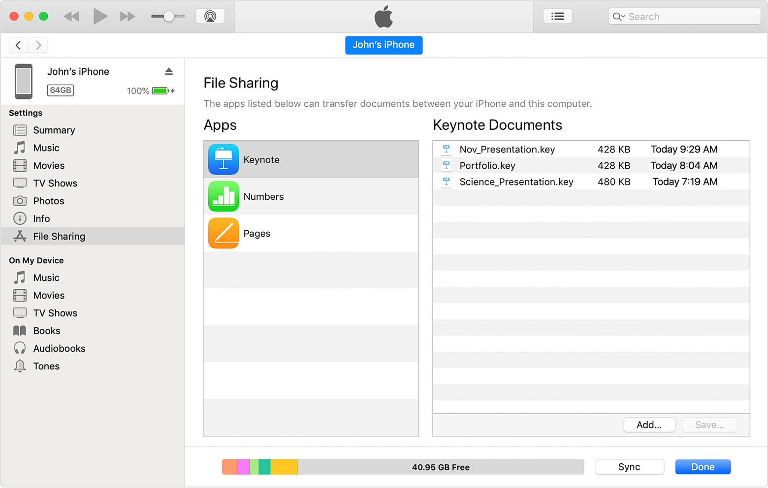 You can also click Add in the Documents list in iTunes, find the file or files you want to copy from your computer, and then click Add. iTunes copies these files to the app on your device. Choose only files that will work with the app. Check the app’s user guide to learn which kinds of files will work.