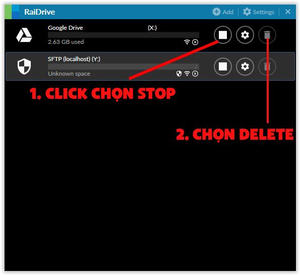 If you don’t want to use that drive, just open RaiDrive, click the Stop button and select the Delete button.