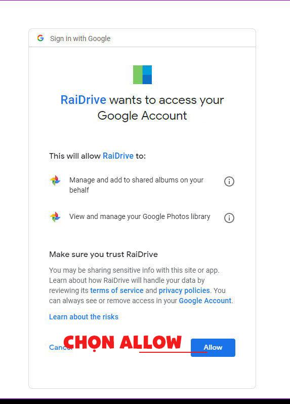 Step 3: Allow RaiDrive to access your files for management by clicking Allow.