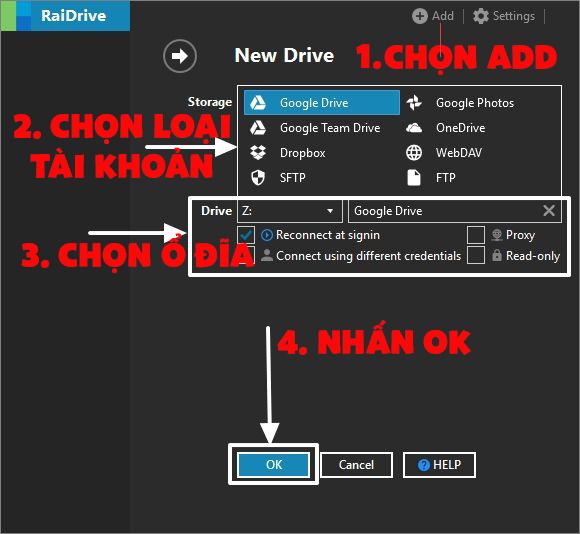 Next to the Storage section, select the type of account you want to create a drive, here RaiDrive supports many types of accounts, of which Google Drive is considered to have the highest stability. If you need to link multiple accounts check the box “Connect using different credentials”.