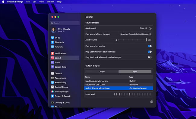 4. Click Sound from the left pane and select Input. Your Mac will display all available input options.