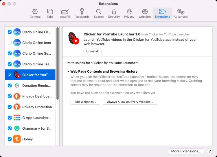 Step 5: Click on the name of the Safari extension you want to delete in the left pane. Then click the Uninstall button in the right pane.