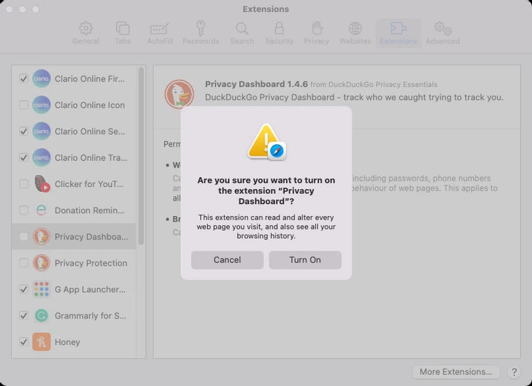 Step 2: Click the Turn On and Review… button next to the New Safari Extensions Available message . This will open the Extensions dialog box in Safari.