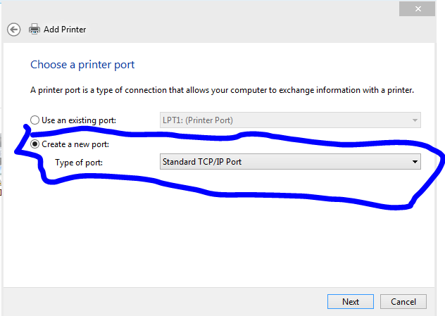 start -> divice printer => Add a printer => select add a local printer => create a new port => Standard TCP / IP